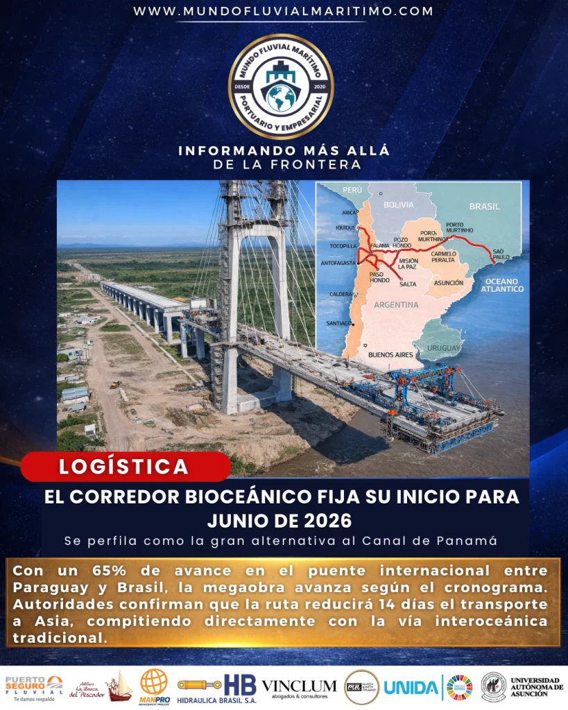 El Corredor Vial Bioceánico, la infraestructura que promete transformar la logística de Sudamérica conectando el Atlántico con el Pacífico, ya tiene fecha estimada de inicio de operaciones: junio de 2026. Según confirmaron autoridades del Ministerio de Obras Públicas y Comunicaciones (MOPC), la habilitación del corredor coincidirá con la inauguración del puente que une Carmelo Peralta (Paraguay) y Porto Murtinho (Brasil).